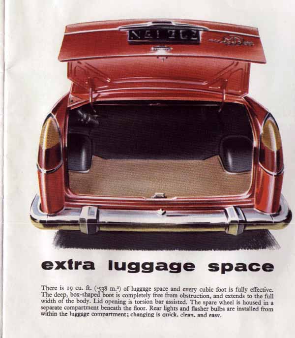 Called a 'boot' in the UK. Massive, and very useful. Fuel tank sits up behind the rear seat, over the rear axle. The SU electric fuel pump is by the tank filler neck, out of the dirt and cold. Spare wheel is in a tray underneath the boot floor. The engine-starting handle is used to wind it down, a good idea if the boot is full.