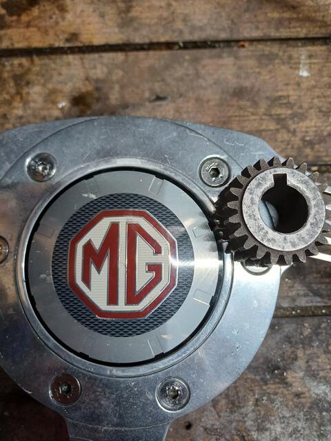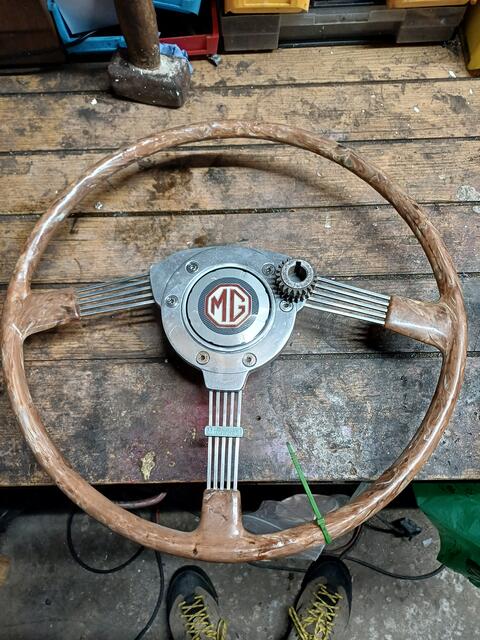 ![]() Doretti aftermarket MG TD steering wheel. Aluminum hub , center, and spokes with wooden wheel and machined MG octagon in the center. |